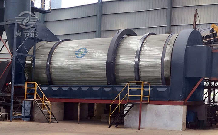 污泥干化處理設(shè)備由三個(gè)同心不同直徑的滾筒嵌套構(gòu)成,特殊的結(jié)構(gòu)設(shè)計(jì)大大延長了污泥在筒內(nèi)的干燥行程,使污泥與熱風(fēng)在有限的容積內(nèi)充分接觸,增加傳熱傳質(zhì)效果。首先濕泥與熱風(fēng)在內(nèi)筒中順流干燥,大塊污泥在“旋耙破碎”打散裝置作用下破解分離,呈沸騰狀,大大提高了污泥與熱風(fēng)的動(dòng)態(tài)接觸面積,并且筒內(nèi)還設(shè)置有分布各異的導(dǎo)料、揚(yáng)料裝置,使污泥顆粒形成更均勻更薄的料幕,充滿整個(gè)干燥空間,在提高烘干效率的同時(shí)降低了能耗,直到物料表面形成不粘不黏的散狀再被送入到中筒內(nèi)。中筒內(nèi)濕泥與熱風(fēng)逆向而行,充分利用內(nèi)筒、中筒熱量的同時(shí),與迎面而來的熱風(fēng)充分接觸,進(jìn)一步蒸發(fā)出污泥內(nèi)部水分,在特制抄板的作用下被送入外筒中。此時(shí)未完成干燥要求的物料慢行、后行,繼續(xù)干燥直到達(dá)到含水率要求,再從滾筒卸料端排出。
